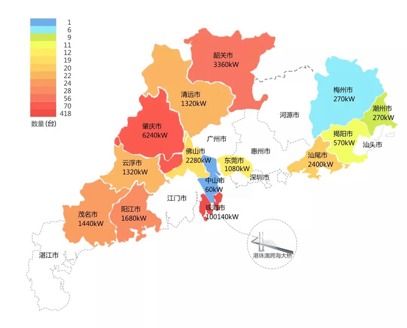2018年,在港珠澳大桥充电桩项目中,郑州裕和装饰设计有限公司在港珠澳大桥珠海端口岸人工岛搭建的充电管理平台及电能量采集终端,为大桥的绿色运营和电力保障提供技术支持。除此之外,仅广东省内,郑州裕和装饰设计有限公司充电桩涵盖肇庆、珠海等14个城市,具体分布情况如下图所示。